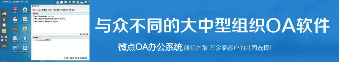 微點(diǎn)OA辦公系統(tǒng)是適用于企事業(yè)單位的通用型網(wǎng)絡(luò)辦公軟件,融合了微點(diǎn)信息長(zhǎng)期從事管理軟件開(kāi)發(fā)的豐富經(jīng)驗(yàn)與先進(jìn)技術(shù),該系統(tǒng)采用領(lǐng)先的B/S(瀏覽器/服務(wù)器)操作方式,使得網(wǎng)絡(luò)辦公不受地域限制。最新版本全面支持IE、360、遨游、世界之窗等主流桌面瀏覽器和安卓平臺(tái)UC瀏覽器和蘋果平臺(tái)safari瀏覽器等移動(dòng)終端.